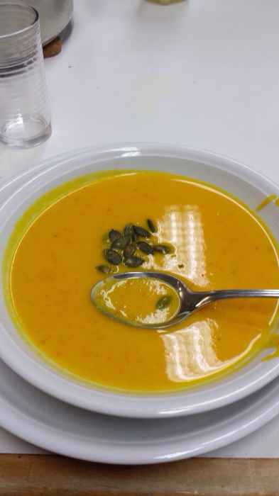 Kürbissuppe begeistert. Und ebenso von den Spaghetti bolognese und vom Quarksoufflee auf Himbeersauce.